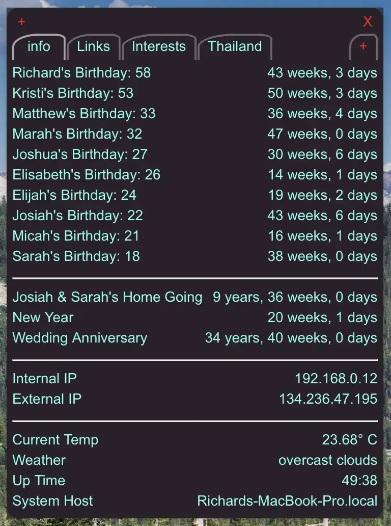 ScriptBar is a program to show the output of the embedded Node-Red server in the EmailIt application. It also displays the output of scripts on your system. ScriptBar doesn't put them in the menubar, but has them all in a convient window for easy viewing. You can have multiple tabs to have many different things show. You can also keep the links to your most visited web sites.